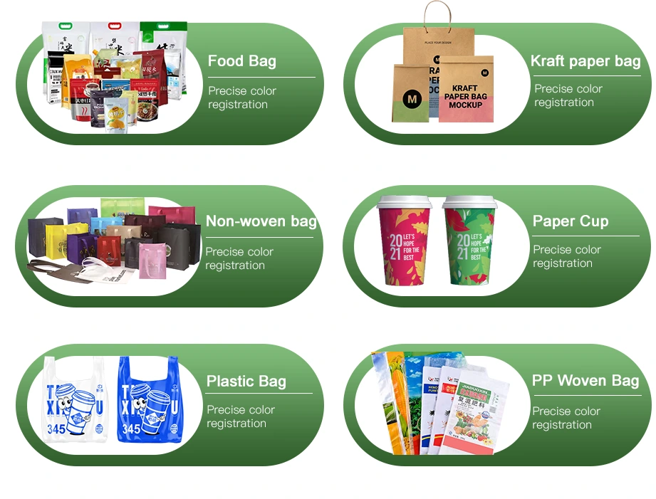 Tinka PE, BOPP, PET, CPP, popieriui ir kitiems lankstiems pagrindams, puikiai tinka maisto pakuotėms, pirkinių maišeliams, etiketėms ir įvairiems lanksčių pakuočių spausdinimui.